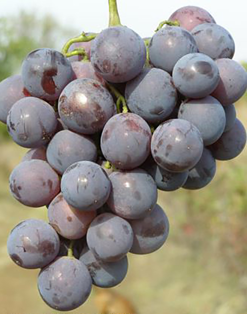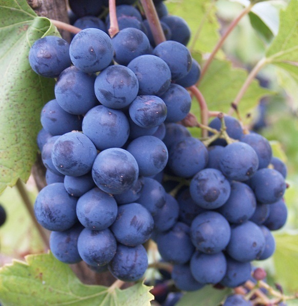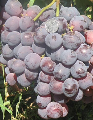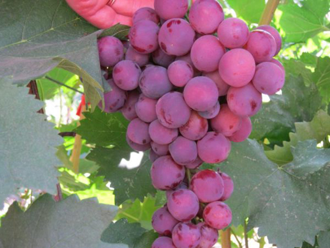 Another type of Cardinal was created in Anapa. Breeders have achieved a significantly greater tolerance of the variety to cold temperatures down to -23 ° C and resistance to diseases, but its ripening period increased to 120–130 days. This medium-ripening table grape has vigorous growing vines with maximum shoot maturity along almost the entire length. Large, not very dense clusters are formed into a cone or cylinder converging on a cone. Their average weight is 450 grams, but bunches of a kilogram or more are not uncommon. Round large berries (7-9 g), when ripe, become red-purple, dark pink or dark blue. They contain up to 22% sugar and up to 10 grams of acid in a liter of juice. Their pulp tastes good with a nutmeg aroma.