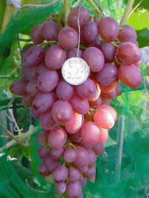 About the origin of this hybrid form there is only an assumption that it belongs to the family of grapes obtained by crossing the Cardinal with the Criuleni grape. Stable ripens early - in 115–120 days. Bushes of this variety have strong growth, flowers are bisexual, young shoots ripen well. Bunches in the form of a cylinder are large, often of medium density, but sometimes dense. They weigh on average from 500 to 900 g. Large round massive berries weighing 7-10, and some up to 20 grams, have a slightly flattened shape. The dense pulp filled with juice is covered with a pink-purple skin imperceptible in food. A light nutmeg flavor complements the pleasant taste of grapes, rated by the tasters at 8.9 points. The sugar content of the variety is 17-19%, the acid content is 5-6 grams per liter of juice. Cardinal resistant can be successfully transported without loss of quality. Its frost resistance is -22 ° С. This grape is unstable to mildew disease, and average resistance to mildew.