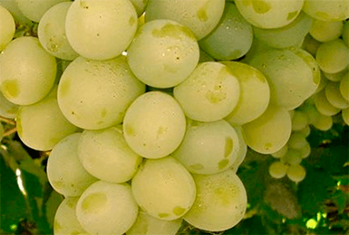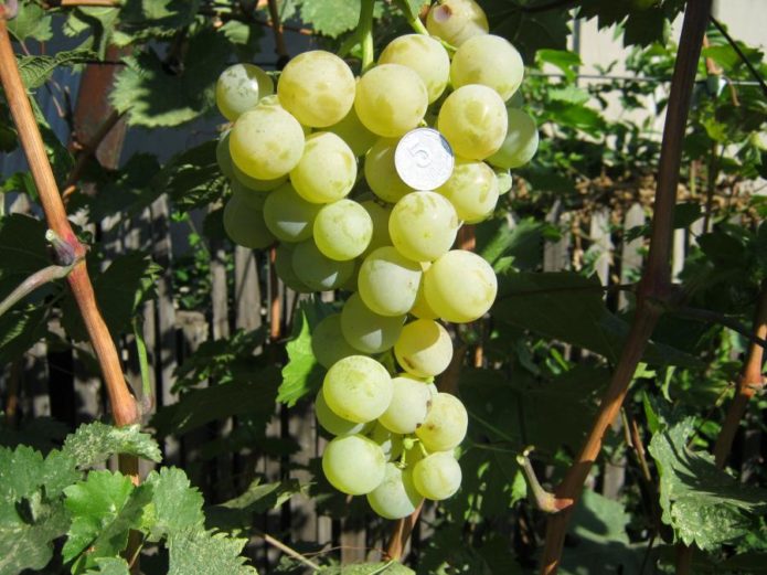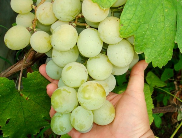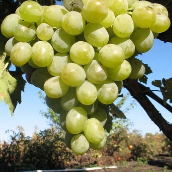 The berries are white, yellowish, greenish at first, and when fully ripe they become amber. In full sun, they can acquire a brownish tan. The shape of the berries is almost round: the ovality is insignificant. Berries are large to medium in size: usually their mass is in the range from 10 to 12 g. There are 2 or 3 seeds in a berry. The skin is thick, but does not interfere with eating. The pulp is dense, fleshy, translucent. The taste is assessed as harmonious, but rather sweet. Total sugar content from 21 to 24%, acidity from 6 to 8 g / l. Mostly these grapes are used fresh. Stores well in the refrigerator.