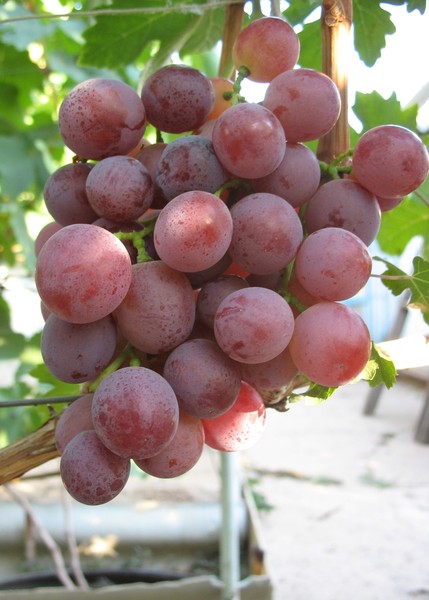 It is difficult to say with certainty about the shape of the bunches: on the same bush, both conical and cylindro-conical specimens can be found, or even completely shapeless. The comb is long. The size of the bunches is solid, but not gigantic: the average weight is about 800 g, some specimens can reach 1.3 kg. There is no peeling: all the berries are about the same size and are tightly pressed together. The brushes tolerate transportation well. When caring for bushes, it is recommended to leave no more than two bunches on each fruitful shoot.