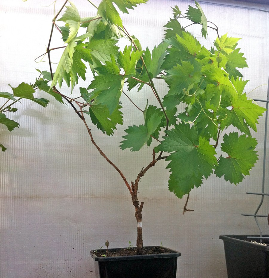 On a young vine, pruning is done by 2 eyes and temporarily shaded. For the first time, a support peg is installed to the seedling and watered through a pipe - this will avoid the formation of roots at the surface, which are often damaged in winter. During the first summer, the grapes will grow by 1.5–2 m and the vine will grow.