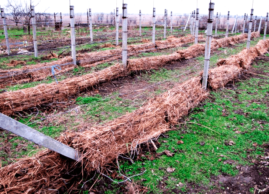 For the winter, the vine is carefully removed from the supports, twisted and loosely pressed to the ground, pinning with a metal wire. From above, the grapes are covered with earth with a layer of 20-30 cm and insulated with straw, spruce branches, needles, if possible - roofing material and non-woven materials (if the region has severe, frosty winters).