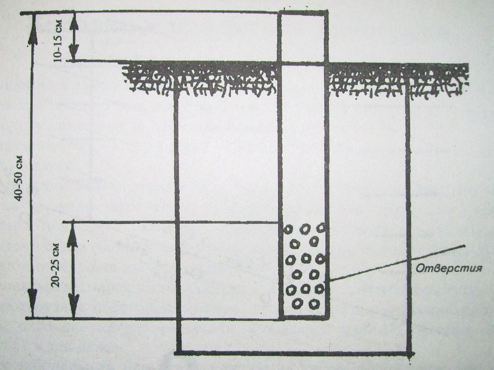 - A layer of expanded clay, crushed stone or crushed brick (15–20 cm) is poured onto the bottom of the hole, leveled well and tamped. On the south side of the pit, a piece of plastic or iron pipe 1 m long and 5–8 cm in diameter is hammered through which the plant will be watered.