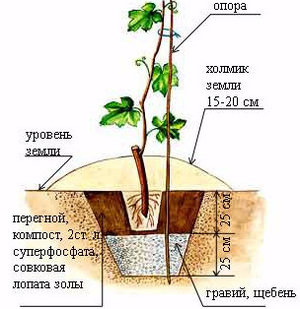 The planting stalk must have at least 6 buds. It must be placed in the hole so that two buds are underground, and 4 are above its surface. The cutting is watered abundantly, dug in, and the soil around it is compacted. After all the operations done, the 2 upper eyes are removed at an angle of 450... This will serve as a catalyst for growth - the grapes will strive to make up for losses and will quickly gain weight.