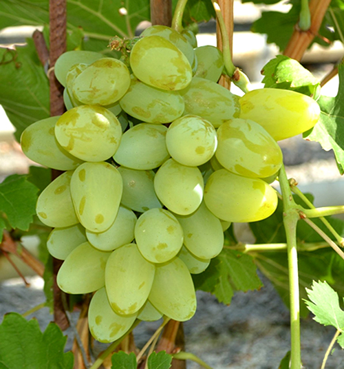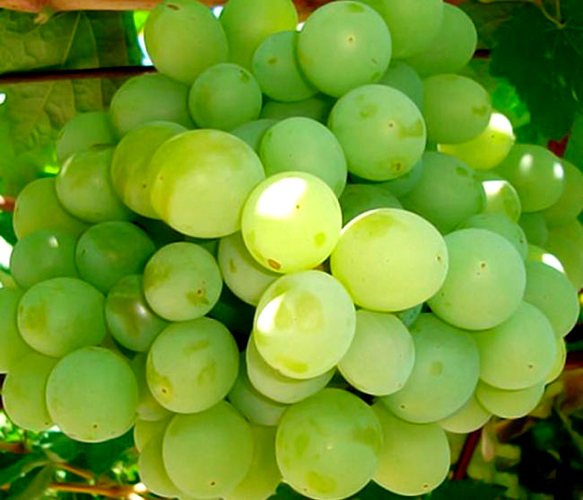 Monarch table grape is a vigorous plant that can withstand frosts down to –25 ° C without shelter. Its bush 2, 5-30 meters high gives many green shoots, the length of which does not exceed 140 cm. On the shoots of the current year, beautiful clusters ripening up to 600 g with large yellow berries. Each berry weighs from 15–20 g, and individual ones - up to 32 g. A light nutmeg aroma gives originality to the taste of this grape. The crop can be harvested within two to three weeks. The bunches will not lose their visual appeal, and they can also acquire a blush from direct sunlight.