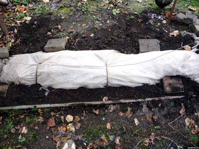 Then 30-40 liters of humus or compost is poured into the pit. If the substrate is heavy, clayey, add another 5-7 liters of sand. Then comes a layer of fertile turf of about the same thickness, mixed with fertilizers (150-190 g of simple superphosphate, 110-130 g of potassium nitrate, 250-300 g of dolomite flour). Gardeners who are not too fond of mineral fertilizing can replace them with wood ash (about 2 liters). The substrate in the pit is well spilled with water. When it settles, about 10 cm of humus is added from above and covered with slate, roofing felt, and other material that does not allow water to pass through. About 40 cm should remain to the upper edge. In this form, the pit remains until spring.