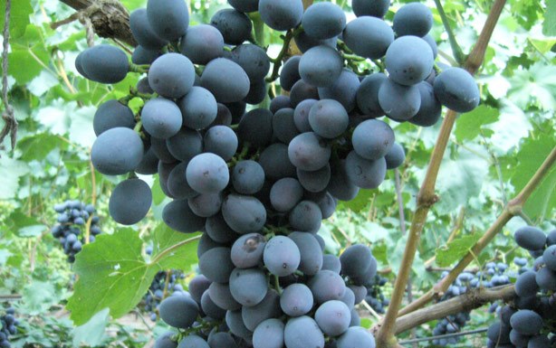 The bunches have a shape close to conical, their usual weight is a little less than a kilogram, the record holders reach 1.5 kg. The berries are not very beautiful.They can be perfectly round or slightly oval, relatively large, weighing up to 10 g, dark blue. A huge drawback is that the ripening is stretched, and ripe bunches must be plucked immediately: they are not stored on the bushes, they wither and become unusable. The skin is firm, crunchy when bitten. The pulp is juicy, dense, with the usual grape flavor. Experts talk about the peculiar aroma of the berries, felt when they are eaten.