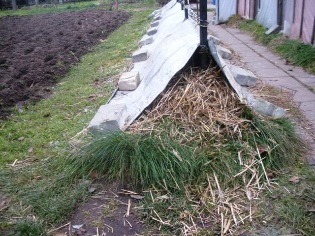 - lay dry mulch on its bottom, and grape shoots on it;