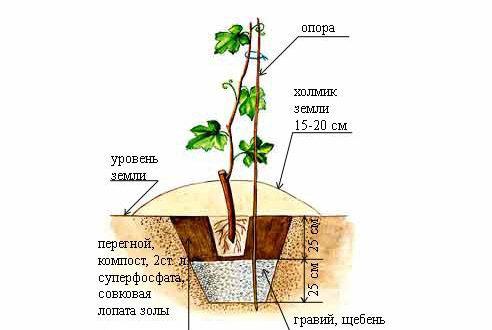It is important to pay attention to the level of occurrence of groundwater, since the roots of grapes do not tolerate stagnant water and rot in conditions of excess moisture. Planting holes are located at a distance of 2.5–3 m from each other, since the plant has a powerful growth force. The same distance is left between the rows. Bushes for better illumination are oriented from north to south.