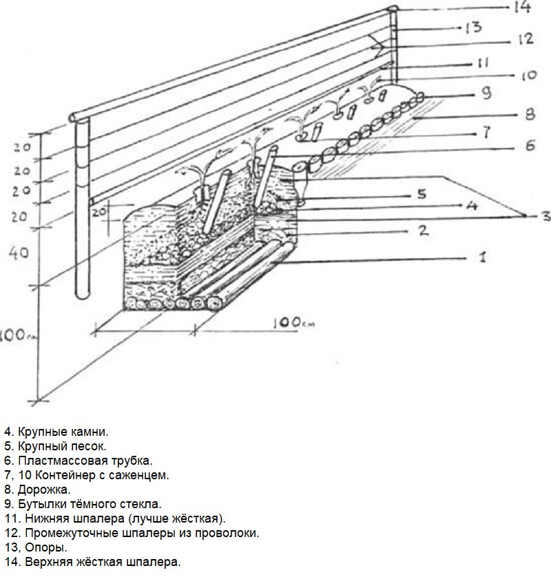 Plants are planted to a depth of 25-30 cm, this is how the soil warms up in the northern regions of Belarus. The upper trellis is made rigid, it will serve as the basis for a temporary greenhouse during recurrent frosts.