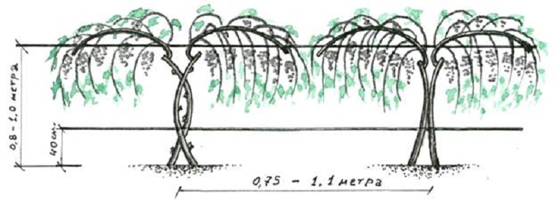 Of the many types of forming grape bushes in the northern part of Belarus, it is worth highlighting the capitate forming. Its essence lies in the fact that the fruit shoot is laid in an arc on the upper trellis, and the green shoots with bunches are not tied up, but hang freely.Due to the fact that they are directed not up, but down, their growth is naturally limited, and this minimizes the number of green transactions.