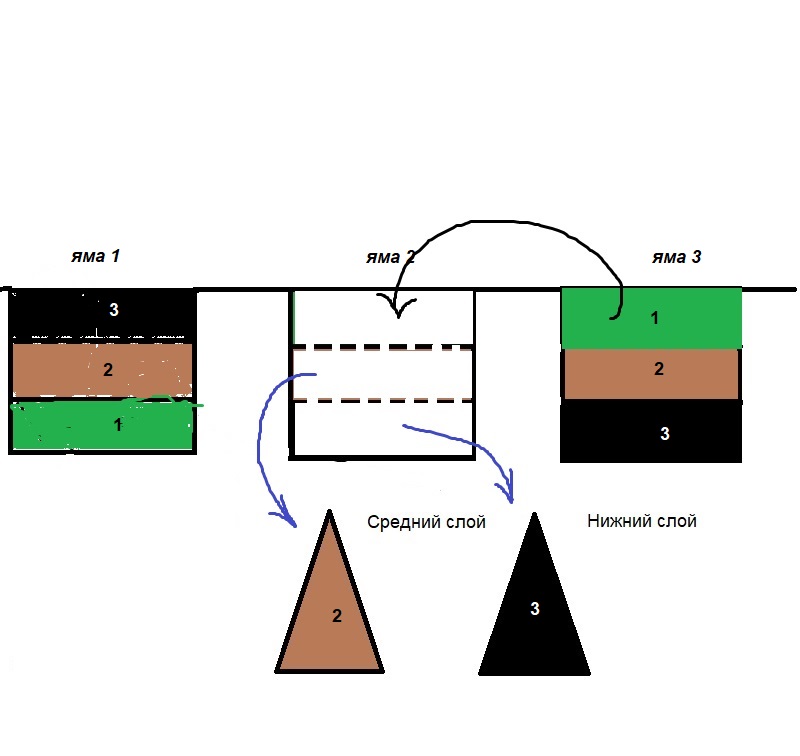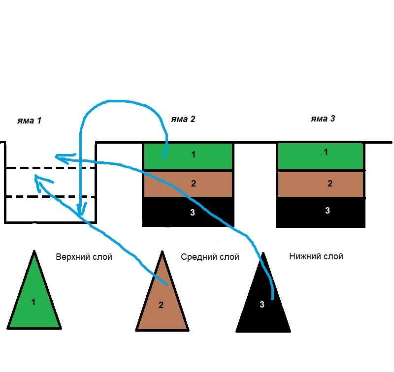 Remove the fertile layer from the second pit and immediately drop it to the bottom of the first pit. Then the middle layer returns there, and then the lower layer of earth from the first pit, which were laid in different directions. The first pit is full.