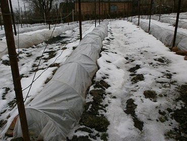 Above, they arrange an impromptu hut made of the same spruce branches, wooden shields over the entire width of the garden, cover them with polyethylene and fix them with something heavy. The ends of the "tunnel" are left open until severe frosts - freely circulating air will not allow condensate to accumulate... If there is no dampness in the shelter, and if it is covered with snow from above, the grapes will survive any frost.