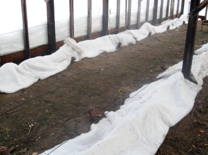 When it gets warmer up to + 15 ... + 20 ° C during the day, and at night + 3 ... + 5 ° C, the upper shelter is turned to one side to exclude the appearance of the greenhouse effect. For two days the vine “breathes” fresh air and dries up, after which prophylactic spraying with 3% Azophos is carried out to disinfect its surface. Then, water-charging irrigation is carried out, spending 20-30 liters of water under one bush.