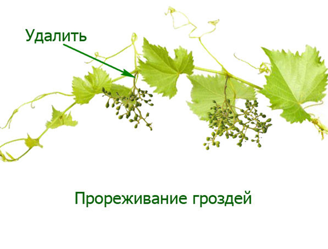 When thinning the leaves, the leaves shading the clusters are removed. In seasons with insufficient heat and rains, this accelerates the ripening of grapes, protects against rotting, increases the accumulation of sugar in the berries.