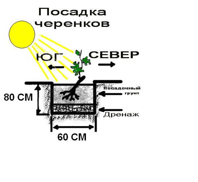 Before planting, a planting pit is prepared with a size of 80x80x80 cm, where the grapes are placed. The roots of the seedling are placed at a depth of 25 cm. The first bud from the roots should be 5 cm below the surface of the ridge.