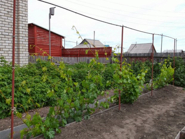 Trellis is a structure made of pillars and wire, located vertically. Its height depends on how vigorous the grape variety will grow on it. Trellis posts are dug into the ground at a distance of 1.5–2.0 m from each other. The wire is pulled every 50 cm, counting from the ground. In the Moscow region, it is advisable to make low trellises in the open field, so that during recurrent frosts, the tied up grapes can be covered with a film. They are also installed when growing crops in greenhouses and greenhouses.