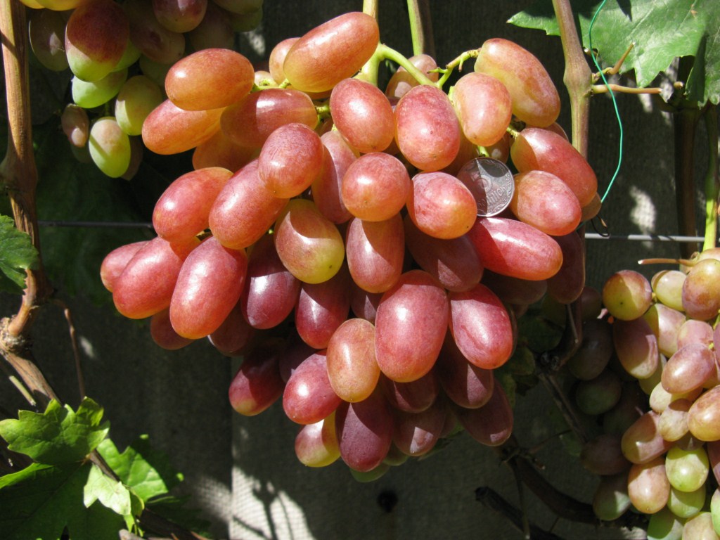 Julian and this year only pleases with a very good resistance to diseases, strength of growth, yield and has already begun to color! The bunches are large, the berry also continues to grow and increase in size. There was a very heavy downpour a week ago. The only berry burst that I continue to watch. The cracks do not rot, they just dry out, there are no berries baked in the sun either. The seedling is second year. Ripened simultaneously with Victor and Transfiguration. Good sugar production, crunchy taste, white-pink color. For another month I hung on a bush in a bag, it became sweeter.