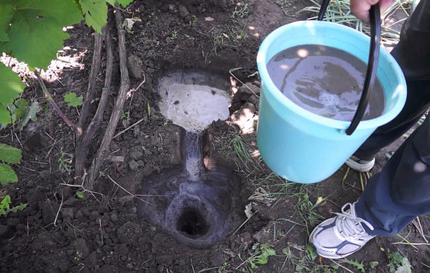 - The hole for grapes is thoroughly watered - 2 buckets of settled water at room temperature per plant.