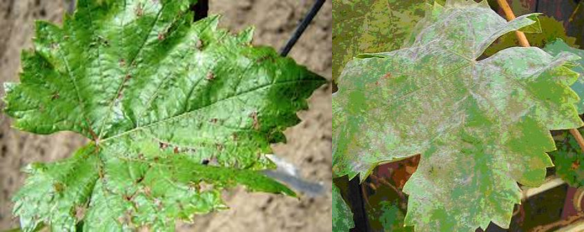 To prevent anthracnose (in the photo on the left), the vineyard is sprayed with Bordeaux liquid, and oidium (photo on the right) - with a solution of colloidal sulfur