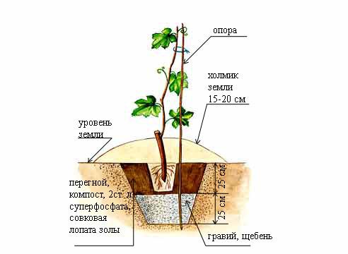 A few days before planting, the land is dug up on the site to improve air circulation. Grapes are planted in cloudy weather, in the afternoon, the daytime temperature should be above +12 ° C. If the gardener plans to plant 1-2 Julian grape bushes, prepare a planting pit; in the case when many plants grow in the vineyard, they dig trenches. In both cases, the planting principles are identical: