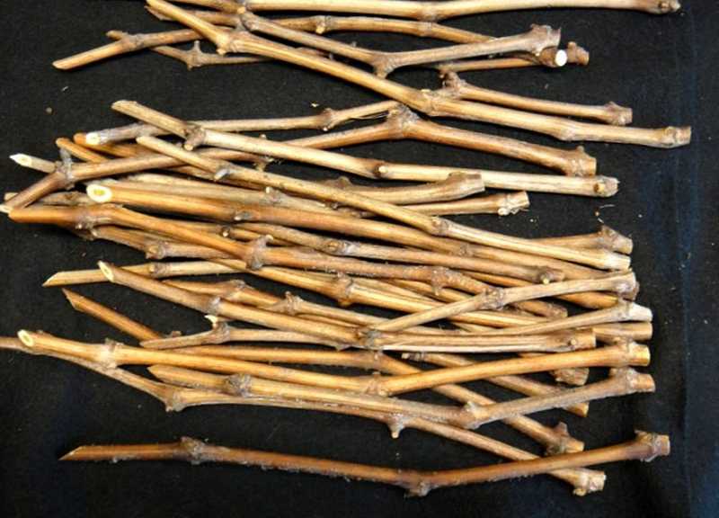 In February, cuttings are taken out and cut into pieces with 2-3 buds. The upper cut is made straight, 2–3 cm above the kidney, the lower slanting 1–2 cm under the kidney.Chopped cuttings are soaked in water for a couple of days. After that, several longitudinal scratches are made in the lower part of the cuttings to facilitate root formation.