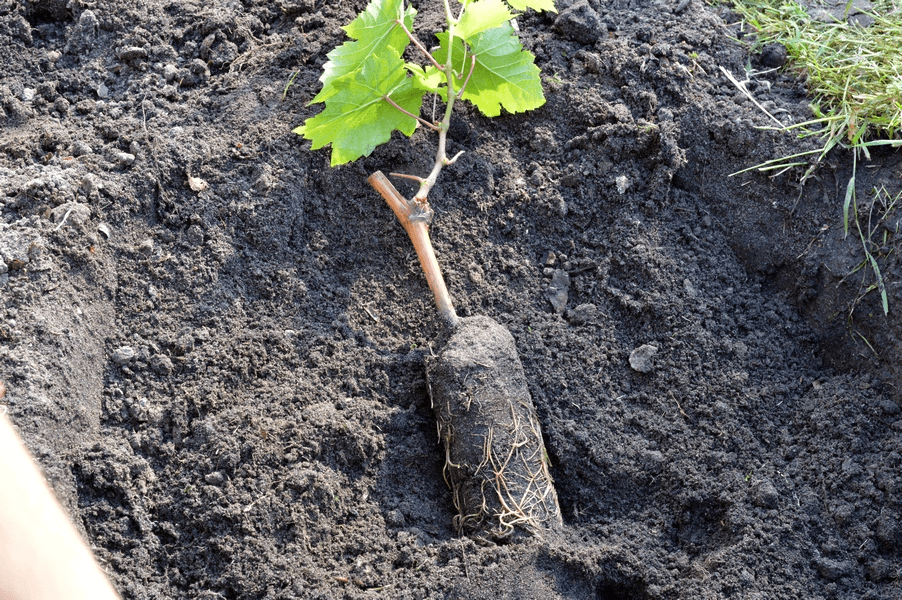 Before planting grapes in a prepared hole, you need to try them on. It will have to be in the hole so deep that only 1-2 buds are visible from the ground.Therefore, it is necessary to pre-pour so much of a mixture of soil with humus so that the seedling, placed with the heel on the bottom, looks out. In advance, you need to drive in a stake for a garter of an intensively growing vine, as well as a piece of a solid inch pipe through which the first 1-2 years will need to water the seedling to the very roots. If there is enough rainfall in the region, and the soil is light, permeable, the pipe is not needed. Then a small mound is poured and a grape seedling is planted. If this is a strong seedling with an open root system, it is planted like ordinary bushes: set on a mound, spread the roots, fill the hole and water it well. If this is a very young seedling, grown at home from a cuttings, you should try to plant it with a lump of earth, carefully removing it from a home container. Such a seedling can be planted higher so that several leaves can be seen from the ground.