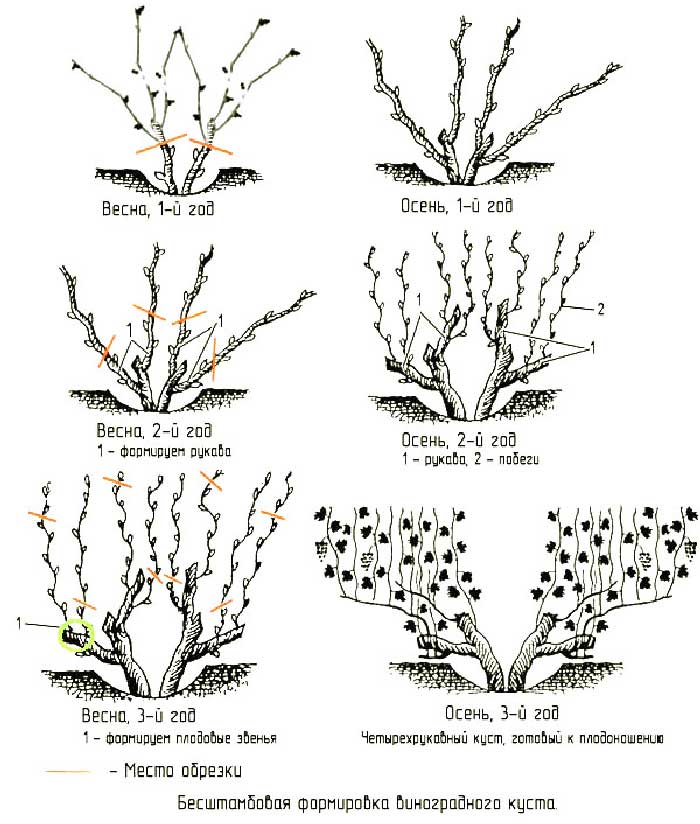 Without going into the details of the methods of forming bushes, it is possible to recommend, without experience, only thinning pruning: cut out obviously unnecessary shoots thickening the bush. Their number also depends on the grape variety: some varieties are more successful when forming a bush in the likeness of a tree, while others give a dozen or more independent sleeves to grow from the base. Pruning is performed with a sharp pruner, the wounds are not covered with anything.Slices try to make at an angle of about 45about 1–2 cm above the kidney.