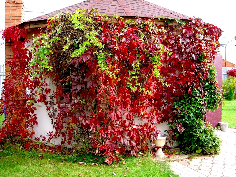 Maiden grapes are a decorative liana, used mainly to decorate the site, since they very quickly twine around all the supports provided to it with beautiful shoots and leaves. In spring and summer, its leaves are dark green, in autumn they are red. Curly shoots cling to any possible obstacles, they can grow up to 20 m in height. The dark blue small berries are completely inedible.