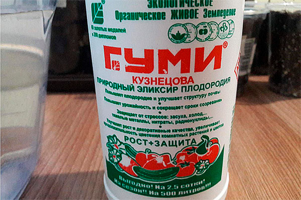 - Organic fertilizer Gumi-20M Rich. It contains 2% nitrogen and phosphorus, 3% potassium, 11 trace elements and the biofungicide Fitosporin-M. It can be used for root dressing by dissolving 1 teaspoon of fertilizer in 1.5 liters of water and for foliar dressing by adding 2 drops to a glass of water. Application interval - 2 weeks.
