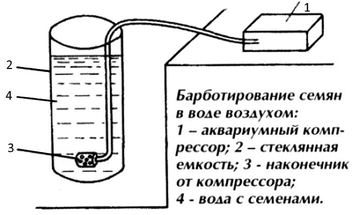 - Bubbling.The seeds are placed in a jar with warm (+ 25-27 ° C) water for 2-3 days, into which the end of the hose from the aquarium pump is lowered and turned on. Then the seeds are dried and sown.