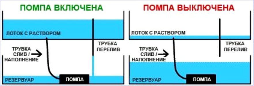 The principle of this industrial technology is that the plants are grown without the use of soil and nutrients are supplied to the roots in liquid form. It would seem that you just need to lower the roots of the plant in a container with a nutrient solution and the growth process will go. But we must not forget that, in addition to food and water, the plant in the root zone definitely needs fresh air, otherwise it will suffocate. Therefore, when designing hydroponic systems (and there are a lot of them developed and created), one has to solve the problem of supplying fresh air and removing waste air. And one more problem is the creation of support for the plant in the absence of soil. We will not give here many different design solutions, we will focus only on the oldest hydroponic method - the method of periodic flooding, which has another name - "ebb and flow". Its essence lies in the fact that the nutrient solution is pumped into the growing container, where it completely covers the roots. After a while, the pump is turned off and the solution is drained by gravity into a container for storing it. Thus, during the draining of the solution, the substrate and root system are saturated with oxygen-enriched air, and when the tank is filled, the rising solution displaces the accumulated gases.