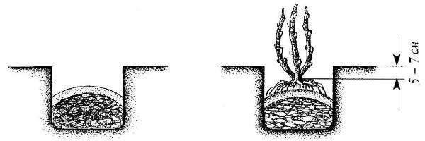 - Planting holes are prepared a week before planting. Neighboring holes are dug no closer than 1.5 from each other. Drainage is placed at the bottom of each pit, then fertile soil, well mixed with the necessary fertilizers. Pour 2-3 buckets of water into the pit.
