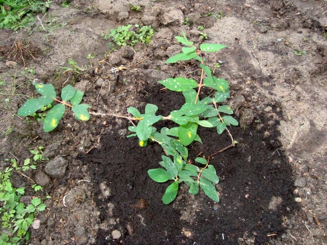 Planting honeysuckle, if you already have ready-made seedlings, is not difficult. This is done in the same way as in the case of almost any berry bush. It is better to plant honeysuckle in the fall (in September or October), when the bush goes into a dormant state. But if you bought a bush in a container, that is, with a closed root system, you can plant it in early spring, from mid-April. For good fruiting, you need to plant at least two bushes, and preferably three. The progress of the main work when planting a bush with bare roots is as follows.